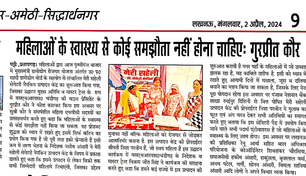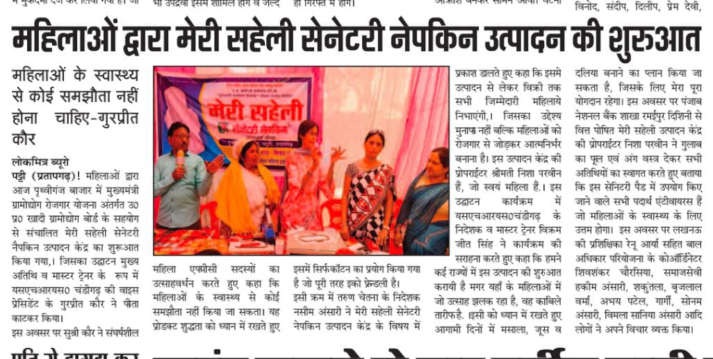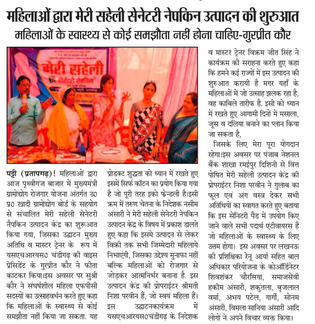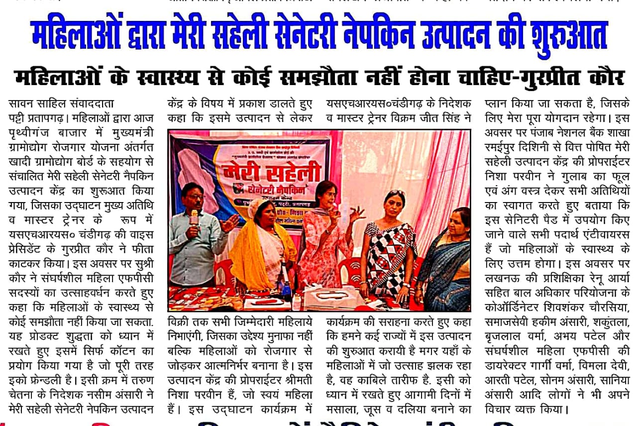 Newspaper coverage highlighting SHRS sanitary pad production initiative, outreach and community impact.